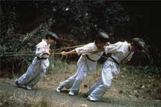 Das ist das Original der Ninja Kids. Die Kampfszenen der Kinder sind toll choreographiert. Obwohl Ninjas eigentlich Ninjutsu praktizieren, wendeten die Jungs bei den Dreharbeiten die im Westen populärere Kampftechnik Karate an. Für die Zuschauer, die nicht gerade Experten sind, ist das völlig egal.